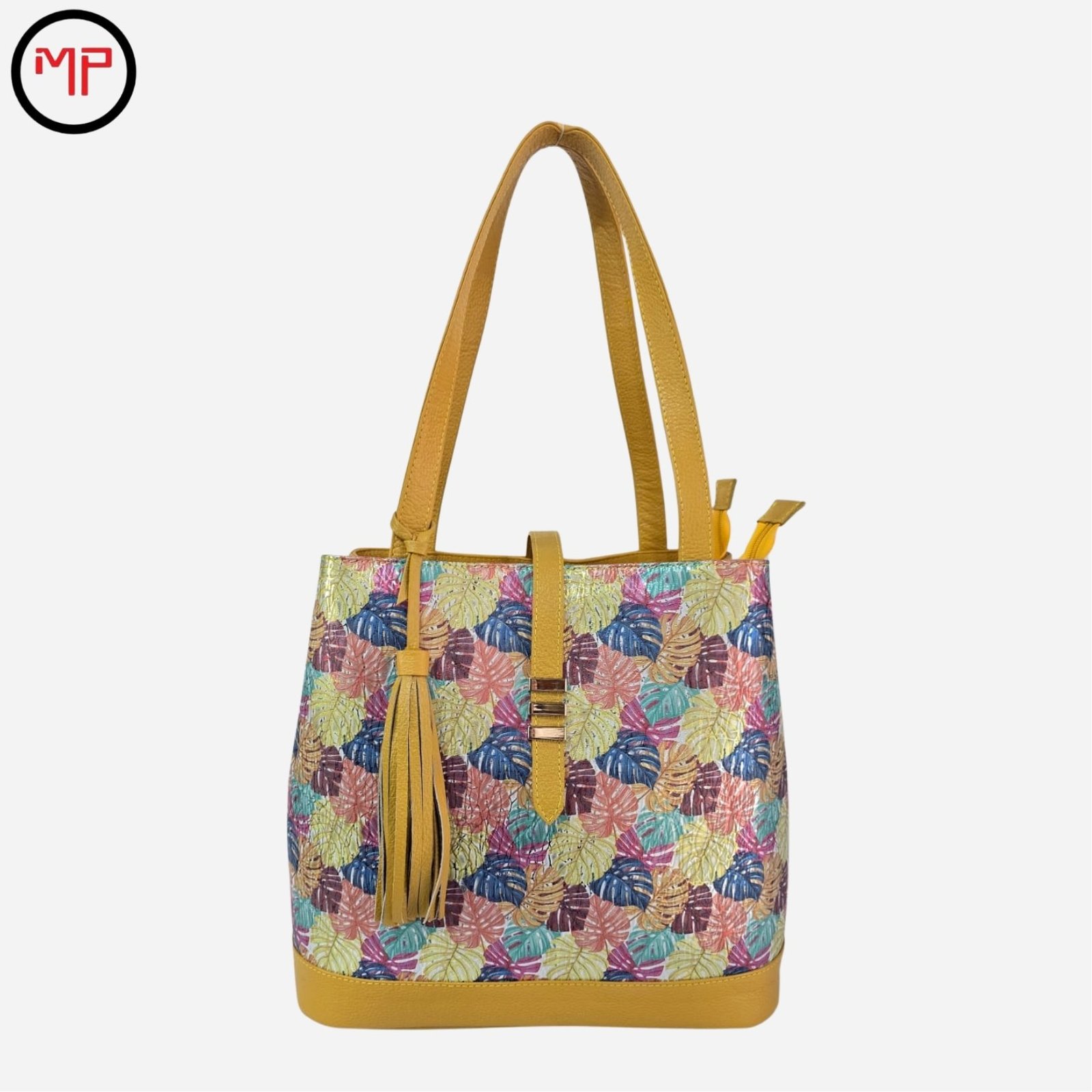 Este bolso de cuero destaca por su color mostaza combinado con tonos multicolores en el estampado de hojas, aportando frescura y elegancia. Perfecto para cualquier ocasión, su diseño llamativo complementa cualquier atuendo, dándole un toque único a tu look.