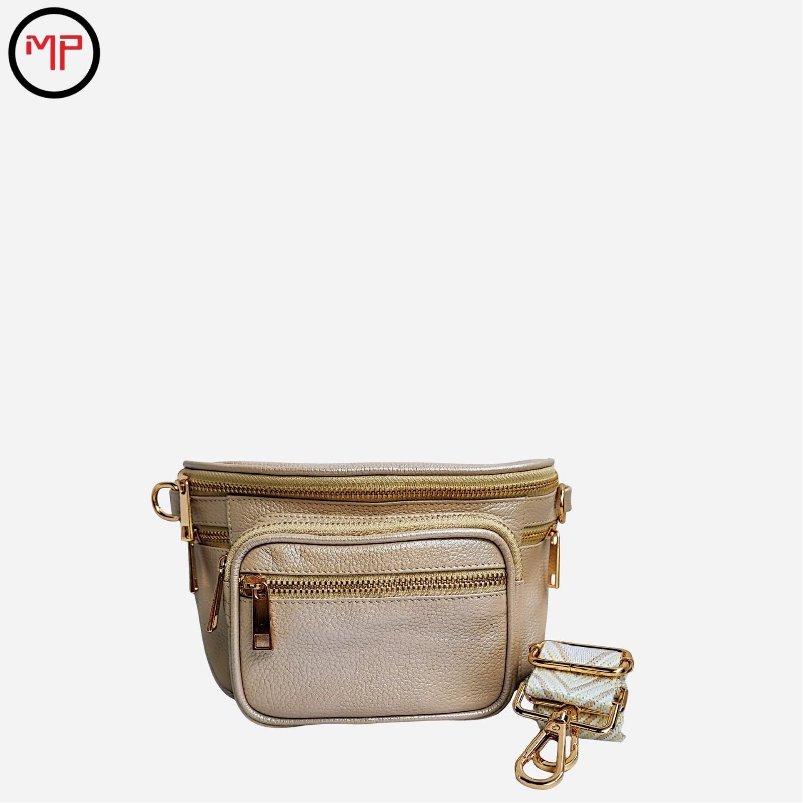 - Riñonera perla de cuero suave y resistente.